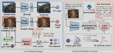 简介:当前的三维视线估计方法在跨越不同数据域时表现出有限的泛化能力,主要原因在于标注数据集的稀缺以及标注数据多样性的不足。 在本工作中,我们提出了一个用于三维视线估计的半监督框架,利用从多样化且不受约束的真实环境中收集的大规模无标注数据,以减轻领域偏差并提升野外场景中的视线估计泛化能力。首先,我们构建了一个涵盖多样化无标注人脸图像的数据集,这些图像在面部外观、背景环境、光照条件、头部姿态以及眼部遮挡方面均具有显著差异。 为了充分利用分布更广的无标注数据,我们采用标准的伪标签策略,并设计了一种奖励模型来评估伪标签的可靠性。除了以三维方向向量形式生成的伪标签外,该奖励模型还引入了由现成视觉编码器提取的视觉嵌入,以及通过提示多模态大语言模型生成的注视视角语义信息,用以计算置信度分数。随后,这些置信度分数被用于筛选高质量的伪标签,并在损失计算中对其进行加权。大量实验表明我们的方法在五个数据集的域内和跨域设置下均实现了最新的性能水平。