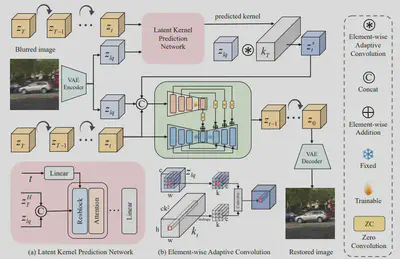 简介:本文提出 DeblurDiff,一种面向真实场景图像去模糊的框架,通过将潜核预测网络(LKPN)与生成式扩散模型相结合,克服现有方法局限。现有方法往往直接将模糊图像作为条件输入扩散模型,导致生成过程难以产生清晰结构;而我们借助预训练 SD 模型先验,引入自适应机制估计像素级模糊核,并通过元素级自适应卷积(EAC)将其应用于局部内容,从而有效保留输入信息与结构完整性。大量实验表明,DeblurDiff 在合成与真实基准上均优于现有最佳方法,兼具结构保真与视觉质量。