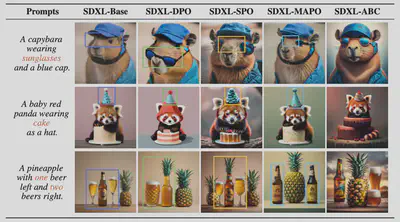 简介:文本到图像扩散模型通常依赖大规模网络数据进行训练,容易出现与人类偏好不一致的问题。我们提出 ABC(基于分类的对齐,Alignment by Classification) 框架,将偏好对齐重新表述为分类任务。与依赖次优 SFT 参考模型的 DPO 方法不同,ABC 假设存在理想参考模型,并将偏好数据视为半监督分类问题。我们设计了数据增强策略,将偏好比较转化为完全监督的训练信号,并提出 ABC 损失函数引导模型对齐。实验表明,ABC 在多种扩散模型上均优于现有方法,展现出高效、稳健且可扩展的偏好对齐能力。