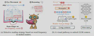 简介:在真实应用中,大语言模型的上下文窗口正被扩展到数十万级别的token,同时模型参数规模也从数十亿级迅速增长到万亿级。这种双重扩张导致计算量和显存成本急剧飙升,使得token压缩成为不可或缺的技术。为此,我们提出一种模仿人类阅读方式的 慢–快token压缩框架:在快速通道中,远距离的上下文被转化为图像,并由一个冻结的轻量级视觉编码器进行快速浏览,以高效提取低显著性信息;在慢速通道中,近距离的上下文则直接输入LLM以进行细粒度推理。此外,我们设计了概率引导的视觉增强目标,在训练阶段对高频token进行掩码,引导Resampler专注于语义丰富的区域——就像熟练的读者会自然忽略功能词一样。在11个上下文学习基准测试中,我们的方法在使用2.3倍更少的token的情况下实现了与原始输入相同的精度,同时计算量降低16%,显存占用减少50%。该方法在 TriviaQA、NQ、PopQA、NLUI 和 CLIN 等任务中,相比当前最强的基于文本编码的压缩方法平均提升7.6%,为大语言模型的 token 高效利用树立了新的标杆。