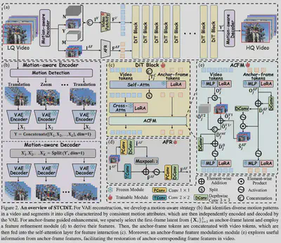简介:近年来,基于预训练 Diffusion Transformer(DiT)的视频超分辨率方法已成为提升视频复原质量的重要方向。然而,其在真实场景中仍面临两大挑战:重建过程难以维持时序稳定性,以及生成阶段难以恢复结构保真的细节。针对上述问题,本文提出 STCDiT 视频超分框架,用于从低质量视频中恢复结构保真且时序连贯的高分辨率结果。在重建阶段,我们发现 Causal VAE 的时序压缩算子仅能聚合局部空间信息,难以在复杂空间变换场景下准确建模跨帧空间对应关系,从而引入重建误差。为此,我们提出一种 Motion-aware VAE 重建策略,将输入视频按运动一致性划分为多个片段,并对各片段独立进行 VAE 编码与重建,从而显著提升复杂运动场景下的时序稳定性。在生成阶段,我们进一步观察到分段编码后,各片段的首帧潜变量未经过时序压缩,相比其他帧保留了更丰富的空间结构信息。基于这一特性,我们提出 Anchor-frame guided 机制,将各片段首帧潜变量作为结构锚点,引导扩散生成过程,从而增强视频整体的结构保真度。大量实验结果表明,与现有最先进方法相比,STCDiT 在结构保真性与时序连贯性方面均取得显著优势。