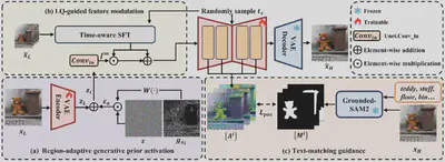 简介:近年来,基于扩散的单步式方法在图像超分辨率领域取得了显著进展,但仍面临三大挑战:(1) 低质量输入LQ经压缩编码导致信息丢失,致使次优保真性能;(2) 生成式先验缺乏区域判别式激活,常导致平滑区域出现伪影,而纹理区域细节不足;(3) 文本交互错位,即扩散模型中文本嵌入的交互区域与其对应的语义区域在空间上未能对齐。针对以上问题,我们提出可控单步扩散网络CODSR用于图像超分辨率。首先,我们提出LQ引导的特征调制模块,其利用LQ输入的原始未压缩信息为扩散过程提供高保真度条件。其次,我们提出基于梯度的噪声加权策略以实现区域自适应的生成式先验激活,在提升感知丰富度的同时保持局部结构保真度。最后我们提出一种文本匹配引导策略,其在训练阶段利用Grounded-SAM2生成文本交互区域图,进而引导并实现在扩散过程中文本与图像交互的空间对齐。大量实验表明,相较于现有最先进方法,CODSR在高效一步推理下实现了更优的感知质量和具有竞争力的保真度。