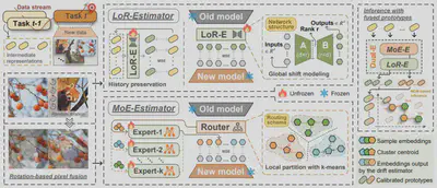 简介:持续学习(Continual Learning, CL)为模型获取新知识提供了一种有效范式,而“不保留历史样本”的学习原则进一步催生了更符合真实应用场景的无样本持续学习(exemplar-free CL)。然而,该范式面临的核心挑战在于语义漂移(Semantic Shift),即需要对历史类别的表征进行可靠激活,使其与当前任务的特征空间保持一致。现有方法通常通过漂移补偿(Drift Compensation)充当这一激活机制,但普遍假设语义分布与漂移在全局范围内均匀一致,这在随机数据流场景下显然并不现实。针对上述问题,本文提出了一种双估计器框架(Dual-Estimator, Dual-E),用于解耦全局与局部语义漂移,从而系统性地应对语义非均匀性问题。具体而言,针对任务内 (Intra-task) 语义分布非均匀性,即低频语义难以获得充分补偿的问题,Dual-E引入了一种由多个网络构成的混合专家估计器(MoE-E),以在多样化的局部表征空间中捕捉不同层次的语义漂移模式。针对任务间 (Inter-task)语义漂移非均匀性,即不同类别的语义变化幅度存在显著差异、统一尺度补偿难以有效覆盖的问题,Dual-E 进一步设计了一种低秩估计器(LoR-E),通过低秩网络建模相邻任务表征空间的全局语义变化趋势。此外,Dual-E 采用解析解形式的高效更新策略,仅需少量训练轮次即可完成参数更新,从而能够以插件方式高效集成至现有无样本持续学习框架中。在多个基准数据集上的大量实验结果表明,Dual-E 在性能上显著优于当前主流方法。