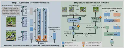 简介:开放集细粒度检索是一项极具挑战性的任务,模型必须能够泛化到未见过的子类别。现有方法通常难以做到这一点,因为它们会从封闭集的训练标签中嵌入特定类别的语义。最近,扩散变换器 (DiT) 通过编码与标签无关的以属性为中心的生成式课程知识,展现出了良好的前景。然而,原始的 DiT 并未针对细粒度的视觉差异进行优化,并且其庞大的规模使得部署变得不可行。为了解决这个问题,我们提出了 DiT-Distill,一个首先提炼然后提炼这些知识的框架。我们引入了一种“条件差异精炼”策略来微调 DiT,使其专注于感知差异的、以属性为中心的细节,而非整体上下文。随后,一种“生成式课程提炼”机制利用生成式融合模块和课程对齐损失,将 DiT 多个扩散时间步中精炼的层级知识迁移到一个轻量级主干模型中。这一过程最终生成了一个高效的检索模型,实现了“无 DiT 推理”。大量实验表明,DiT-Distill 在开放集细粒度数据集上取得了最先进的性能。
